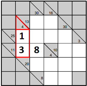 Aşağıdaki kakuroyu adım adım çözelim. Kırmızı ile işaretlediğimiz bölgedeki iki kareye yazacağımız rakamların toplamının 4 olması gerekiyor. 2-2 yazamayız çünkü aynı sütunda “2” rakamını iki kez kullanmış oluruz. O yüzden 3-1 yazmalıyız. Peki hangi rakamı hangi kareye yazacağız?